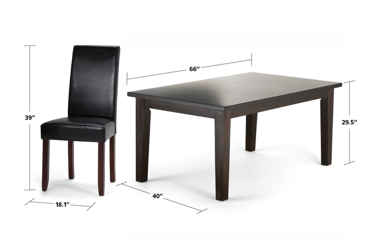 Elevate your dining experience with this dining set, featuring the robust Eastwood Dining Table paired with sleek Acadian Parson Dining Chairs. The 66-inch rectangular rubberwood table boasts a thick, java brown top with inset legs, showcasing the wood's natural beauty. Complementing the table are comfortable Midnight Black vegan leather chairs, supported by solid rubberwood frames. The chairs' high backrests and plush foam cushioning ensure ergonomic support for extended gatherings. This 6-person set seamlessly blends modern and classic aesthetics, fitting various decors. Both table and chairs are built to last, with the table's hand-applied lacquer finish and the chairs' kiln-dried wood construction offering durability for daily use. Easy to assemble, this stylish set brings functional elegance to your dining space.