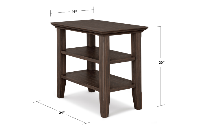 The Acadian Narrow Side Table in Brunette Brown is a beautifully handcrafted solid wood accent table designed for transitional, traditional, and contemporary spaces. Made from sustainable kiln-dried pine wood, this eco-friendly end table features a low-VOC, hand-rubbed finish that highlights the natural wood grain. Its slim profile and two open shelves make it ideal for small living rooms, bedrooms, family rooms, dens, or entryways, serving as a functional side table or nightstand.