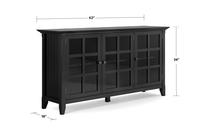 You want to make a grand statement and Acadian Wide Storage Cabinet will do just that. Three framed tempered glass doors open to three adjustable shelves allowing you to reconfigure the layout to suit your needs. Display your fine china, decorative accents or even movies on dedicated display space for a clean, distinctive look.
