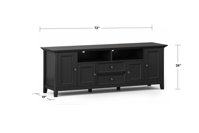 Designed for both style and function, the Amherst 72-Inch Wide TV Media Stand offers a solid wood construction that blends durability with timeless appeal. Ideal for large living rooms and entertainment spaces, this media console table accommodates TVs up to 80 inches while providing ample storage for electronics, décor, and accessories. Featuring two cabinets, two drawers, open shelving, and adjustable shelves, it offers versatile organization options. The warm light golden brown finish highlights the natural beauty of the wood grain, while subtle molding details create a refined, classic look. Plus, cable management cutouts keep wires neatly concealed, ensuring a clutter-free setup. Whether used for home theater organization, gaming consoles, or display storage, this elegant wood TV stand is a statement piece built to last, reflecting Simpli Home’s commitment to quality craftsmanship and sustainable materials.