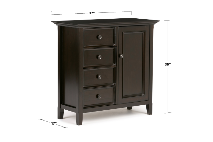 The Amherst Medium Storage Cabinet combines timeless craftsmanship with practical storage, making it an essential piece for any home. Handcrafted from solid pine wood, this cabinet features a warm golden brown finish, enhancing the natural grain while ensuring long-lasting durability. Designed with four drawers and a spacious cabinet with adjustable shelves, it offers versatile storage for linens, dinnerware, office supplies, or everyday essentials. Its transitional-style design, clean lines, and panel detailing bring character and function to your entryway, living room, or dining space. Built with kiln-dried wood to resist warping and cracking, this sturdy storage solution is both elegant and durable, blending seamlessly with traditional and modern interiors.