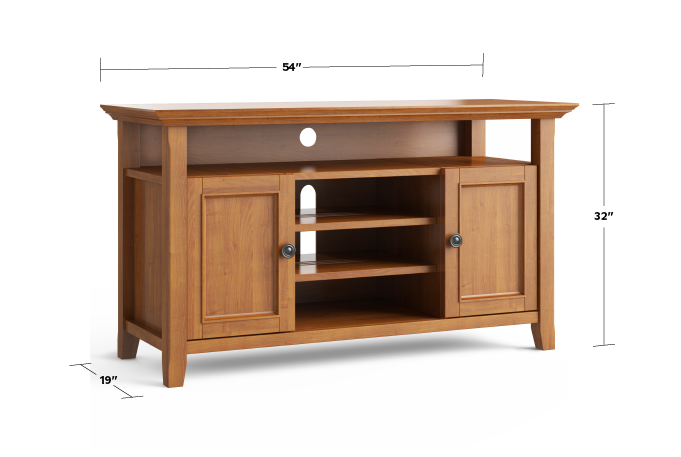 The Amherst TV Media Stand blends timeless craftsmanship with modern functionality, offering a solid wood construction built for durability and style. Designed to accommodate TVs up to 60 inches, this 54-inch TV stand features ample storage with adjustable shelves, two cabinets, and open shelving, making it perfect for media components, gaming consoles, or decorative accents. The medium saddle brown finish highlights the natural wood grain, adding warmth and depth to any living space. Thoughtfully designed with rear cutouts for cable management, it keeps wires organized and out of sight. Whether placed in a living room, den, or home office, this versatile media console combines quality materials, practicality, and timeless appeal, reflecting Simpli Home’s commitment to sustainability and expert craftsmanship.