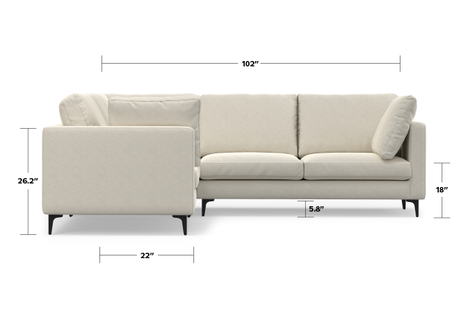 - Handcrafted, mid-century modern corner sectional sofa with tall, elegant metal legs is generously sized to offer comfortable seating for 5 people; it measures 102-inches wide and accommodates up to 1,200 lbs.