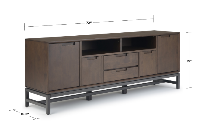 The Banting Collection is made from richly-grained solid Rubberwood.. This mid-century modern industrial collection has a clean angular metal base, with square, simple modern drawer and table top. With no visible hardware, and only simple wood pull handles, the solid Rubberwood top, is simple and uncomplex. The Banting 72 inch Wide TV Table has one working drawer with full extension ball bearing drawer glides, one flip down door compartment, four doors opening to large storage space and an open storage area to maximize functionality. The 72" width is perfect for TVs up to 80 inches and gives you lots of storage possiblities. The Banting collection includes coffee, console, end tables, tv stands, sideboard buffet, desks and bookcase.