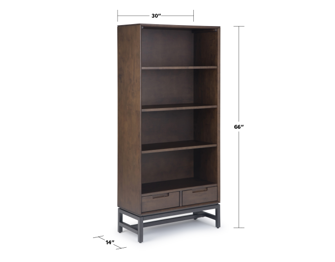 The Banting Collection exemplifies Industrial style, combining solid wood with metal. All pieces in the collection have a clean, angular design and feature metal bases with a bottom support bar to enhance stability. No visible hardware and recessed pull handles on cabinet doors and storage drawers add to the streamlined look. The Banting Bookcase has 2 adjustable shelves, 2 fixed shelves, and 2 small drawers to provide plentiful storage and display space. Measuring 66" high x 30" wide x 14" deep, this versatile bookshelf can be an ideal storage piece for a living room, home office, or basement. Matching pieces in the Banting Collection are available for a complete look.