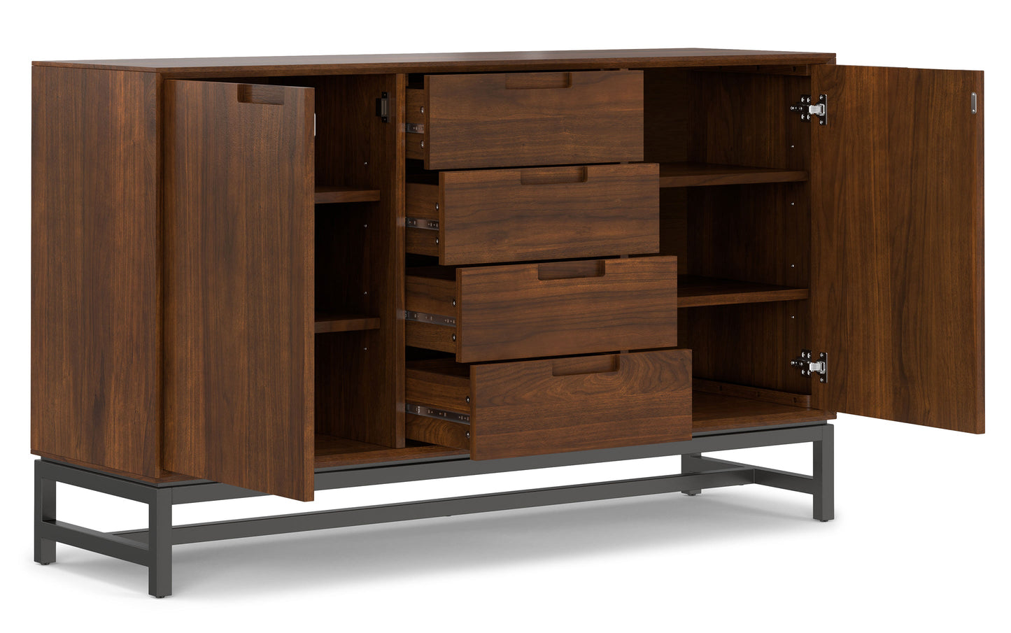 The Banting Collection exemplifies Industrial style, combining solid wood with metal. All pieces in the collection have a clean, angular design and feature metal bases with a bottom support bar to enhance stability. No visible hardware and recessed pull handles on cabinet doors and storage drawers add to the streamlined look. The Banting 60-inch Sideboard Buffet has four drawers and two storage cabinets that maximize functionality in a dining room, providing ample space for dinnerware, flatware, table linens, and more. Plus, the top surface of this buffet can be used as a serving station when hosting, or as a spot for vases, plants, and other decorative objects. Matching pieces in the Banting Collection are available for a complete look.