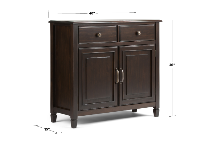 - Traditional Style: The Connaught Entryway Storage Cabinet in Dark Chestnut Brown features a smooth, hand-applied finish and solid wood construction for a refined, elegant look. Plus, it features vintage raised-panel doors and drawers, as well as notched legs.