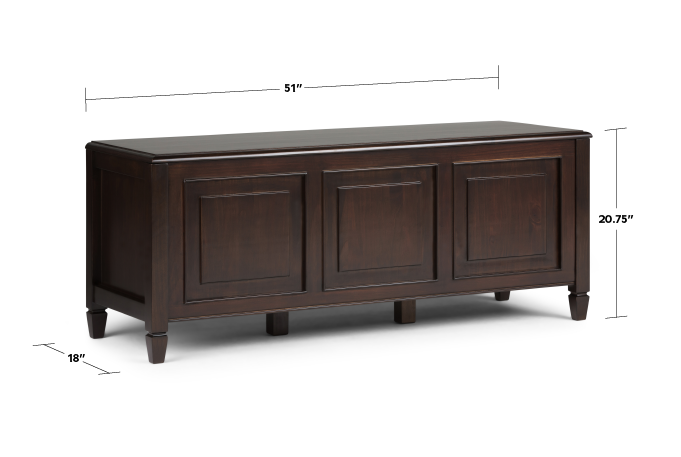 Overwhelmed by junk? Need help organizing the clutter and keeping it out of sight? The Connaught Storage Bench Trunk is a versatile furniture piece that can be used throughout your home. Whether in the family room, bedroom, hallway, kids room, or den, this trunk is the perfect solution to store anything. Its lid with child safety hinges opens to reveal three large storage compartments. Beautifully crafted from solid wood with a Dark Chestnut Brown stain, its classic design details lend a timeless look to any room.