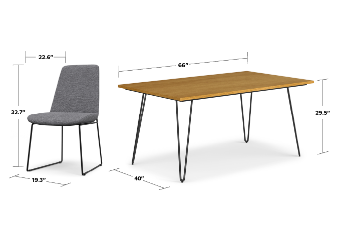 Elevate your dining space with the Hunter and Corina Dining Set, a perfect blend of modern sophistication and industrial charm. The 66-inch rectangular oak veneer table, featuring unique wood grain patterns and a durable lacquer finish, comfortably seats six. Its black metal hairpin legs create an airy, open feel ideal for smaller spaces. Paired with the table are six Corina dining chairs, upholstered in soft grey linen-look fabric. These chairs boast contoured seats with high-density foam padding for lasting comfort, supported by sleek powder-coated black metal sled bases. The set's contemporary aesthetic, combining solid wood and metal elements, suits various interior styles from minimalist to industrial. Durable and easy to maintain, this dining set promises to be the centerpiece of countless memorable meals and gatherings.