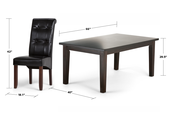 - Contemporary dining set includes a 66-inch rectangular rubberwood table and six vegan leather chairs in Midnight Black for a stylish, modern look.
