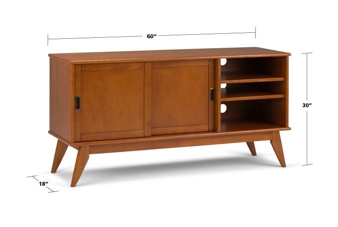 Your TV deserves a stylish and sturdy stand. The Draper Mid Century - Modern Medium TV Media Stand is a well-designed piece of furniture. The right side features two adjustable shelves with cable management cutouts for your electronics. Two sliding doors open to reveal a roomy storage space for your DVD or game collection. This 30†high stand can accommodate a TV up to 65â€.