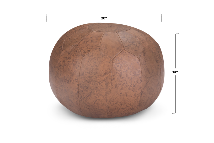 Make a tasteful addition to your home decor with the Drury Round Pouf. The pouf is upholstered in a patterned aniline-dyed genuine buffalo leather with stitching detail. Can be used as an ottoman or extra seating. This versatile pouf is sure to enhance the style of your space.
