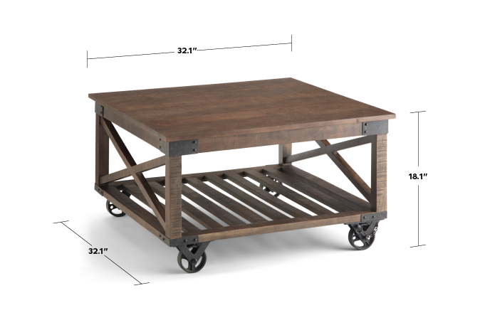 The Harding Square Coffee Table pairs the industrial with the rustic to create a distinctive design. Hand-crafted from solid mango wood with iron hardware, this large coffee table exemplifies industrial style. Unique iron wheels offer mobility and can be easily locked into place. The open slated bottom shelf offers plenty of storage space and X-side details, bracket corners with rivets round out the design.