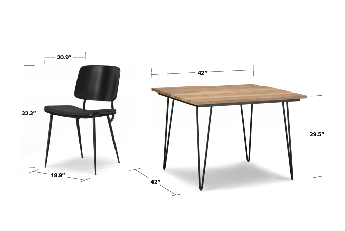 Elevate your dining space with the Hunter and Hayley Dining Set, a perfect blend of mid-century charm and modern functionality. The 42-inch square mango wood table, supported by sleek black hairpin legs, offers an airy, industrial-chic look ideal for small spaces. Paired with the Hayley chairs, which pay homage to Børge Mogensen's iconic Søborg design, this set creates a striking ensemble. The chairs feature molded plywood backrests and cream vegan faux leather seats, providing ergonomic comfort and easy maintenance. With its natural wood grain tabletop and minimalist black accents, this dining set effortlessly combines rustic warmth with contemporary style. Whether in a cozy apartment or an open-concept home, this versatile set adapts beautifully to various interior designs.