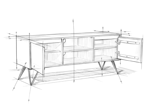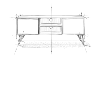 - Features two (2) side cabinets with two (2) adjustable shelves and soft closing hinges with open central space with one (1) shelf and four (4) black iron hairpin legs