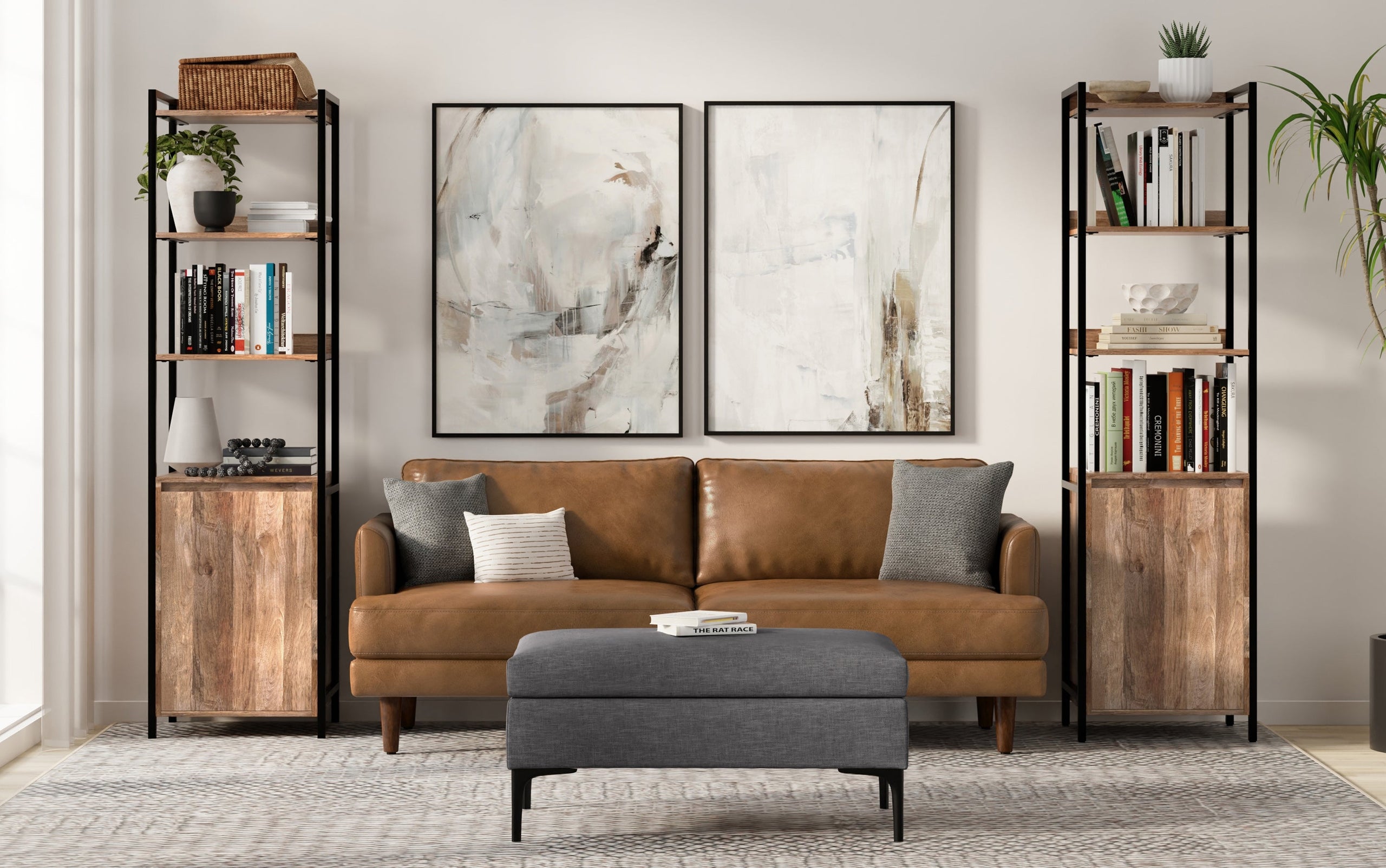 - Each bookcase features four (4) open, fixed shelves and a storage cabinet that opens to reveal one (1) adjustable shelf and one (1) fixed shelf.