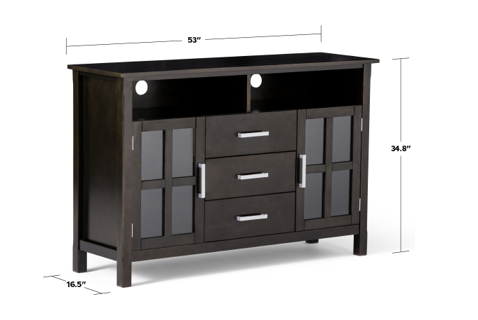 Having just purchased your dream large flat screen TV - you need the perfect TV Stand to enhance your viewing pleasure. Look no further. The Kitchener TV Stand is perfectly sized for TVs up to 60 inches. The 35 inch height puts the TV at a level that is ideal for comfortable viewing. The Kitchener TV Stand has plenty of storage and space for all your media and gaming devices. It has two large upper open shelves and three centrally located drawers. The two large side storage cabinets open to one adjustable shelf. The unit features cord management cut-outs for easy installation of TV and media components.
