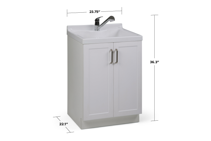 The Kyle 24-inch Utility Sink and Cabinet combines functionality and style, ideal for compact laundry rooms, mudrooms, and garages. This shaker-style laundry cabinet, finished in classic white, features a deep, durable ABS sink and a convenient pull-out chrome faucet that makes cleaning stubborn stains, soaking dirty items, and filling buckets easy. Behind its two doors lies spacious storage to keep laundry detergent, pet supplies, and other cleaning products organized and out of sight. Crafted from quality materials that are water-resistant, this laundry cabinet with storage ensures durability and timeless appeal.