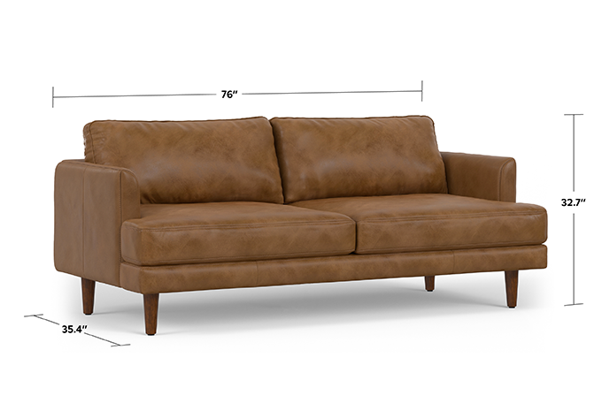 The Livingston 76-inch Loveseat Sofa is designed to bring mid-century modern charm to compact spaces. Upholstered in Caramel Brown Semi-Aniline Genuine Leather, it offers both softness and durability. Featuring a wide seating area, medium-firm cushions, and a solid handcrafted frame, this oversized loveseat for two is ideal for relaxing in smaller living rooms, apartments, or open-concept condos. Its versatile design seamlessly blends with modern and transitional decor styles, making it a stylish and functional addition to your home.