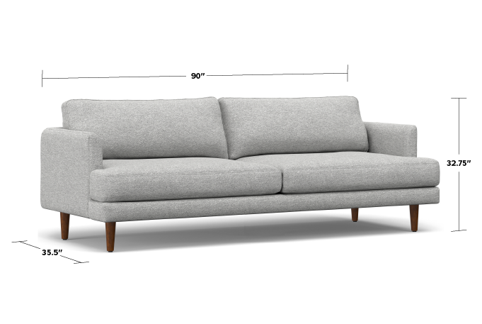 The Livingston 90-inch Sofa is designed to bring mid-century modern charm to compact spaces. Upholstered in Mist Grey Woven-Blend Fabric made with 56% recycled polyester, a soft yet durable material with a textured finish, it offers both beauty and practicality. Featuring a wide seating area, medium-firm cushions, and a solid handcrafted frame, this large sofa for three is ideal for relaxing in larger living rooms, apartments, or open-concept condos. Its versatile design seamlessly blends with modern and transitional decor styles, making it a stylish and functional addition to your home.