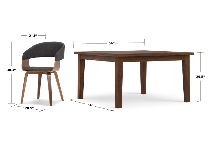 Elevate your dining experience with the Eastwood Square Dining Set, a perfect blend of style and functionality. This set features the robust Eastwood Square Dining Table, crafted from solid wood with a walnut veneer, and four Lowell Bentwood Dining Chairs. The 54-inch square table offers an intimate dining space for four, showcasing a thick tabletop with inset legs that highlight the natural wood grain. Complementing the table are the sleek, curved bentwood chairs, upholstered in durable charcoal grey linen-look fabric. The set's mid-century modern design effortlessly enhances any dining area, while the table's protective lacquer finish and the chairs' sturdy construction ensure long-lasting durability. Transform your meals into memorable gatherings with this stylish and comfortable dining set.