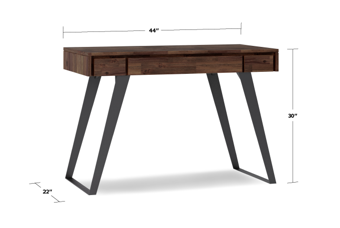 Combine industrial, urban style and function with the Lowry Small Desk. This desk is crafted of solid Acacia with solid metal legs. Generous in size, this desk offers a spacious top surface and includes a keyboard tray for added convenience. Two notched handle drawers provide plenty of space for small office supplies. Working from home office or den never felt so good