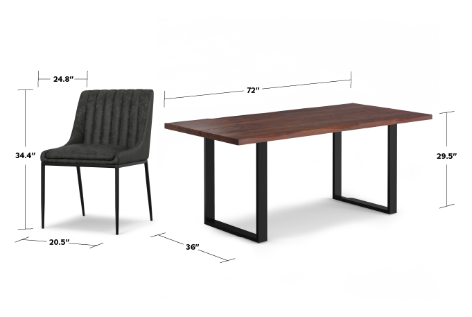 - Complete 7-piece dining set includes a 72-inch acacia wood table and six Melody dining chairs in distressed slate grey vegan leather.