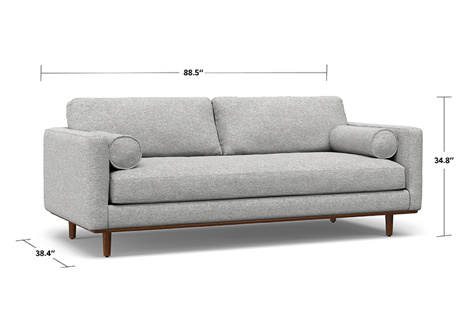 The Morrison 89-inch Sofa combines sumptuous style with irresistible comfort, making it a centerpiece for any living space. Measuring 89 inches wide and accommodating up to 900 lbs, this handcrafted mid-century modern sofa is generously sized to provide comfortable seating for three people. Upholstered in Mist Grey Woven-Blend Fabric made with 56% recycled polyester. The single bench cushion offers a seamless seating experience without the hassle of cracks between cushions, while two wide, loose back cushions can be fluffed or repositioned to match your personal preference. Completing the luxurious design are padded armrests and two loose bolster pillows for added support. Handcrafted with premium materials, this sofa offers exceptional durability and support, making it a stylish and functional choice for family life and entertaining.