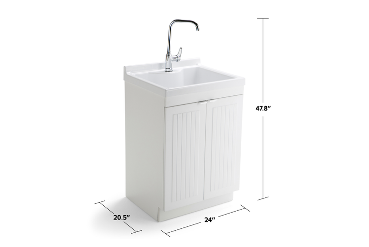 The Murphy 24-inch Utility Sink and Cabinet offers a smart, space-saving solution for compact laundry rooms, mudrooms, garages, or utility spaces. Featuring a 10.8-inch-deep, durable ABS sink, this laundry cabinet with faucet is perfect for soaking stubborn stains, hand-washing delicates, and even bathing small pets. The sleek, beadboard-style double doors open to ample interior storage, allowing you to organize laundry, gardening, and cleaning essentials with ease. Complete with a chrome high-arch single lever pull-out faucet, this utility sink with storage provides versatile water control for various cleaning tasks, like rinsing muddy gardening tools and filling buckets. Constructed from durable, water-resistant materials, this cabinet balances style, functionality, and resilience.