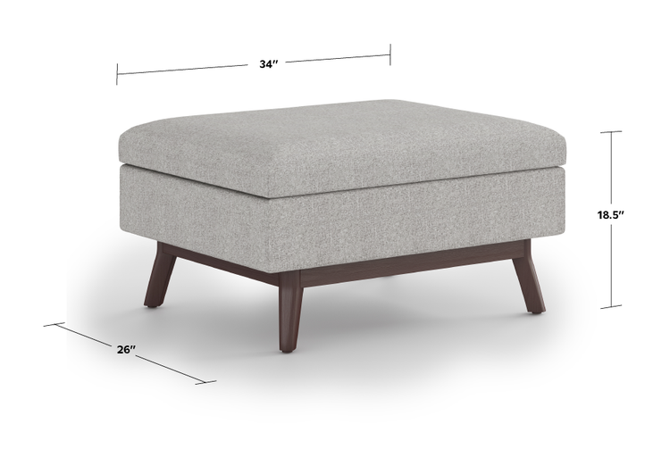Update your space with the Owen Mid Century Storage Ottoman. Its modern style will add a fresh on trend look to your home. It features a lift up lid and a large interior storage space. Made with solid wood and premium fabrics for stylish durability and comfort. Whether used in the living room, family room or den, it will be the showpiece that completes the room.