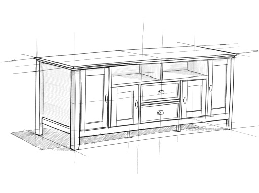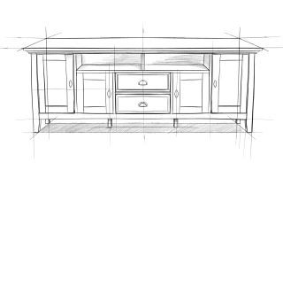 - Features a large centrally located open area with two open spaces, two (2) drawers as well as two (2) framed doors with enclosed spaces; the two (2) large side storage cabinets open to one (1) adjustable shelf each.
