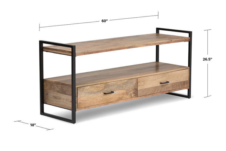 - Features two (2) large drawers, large open shelf, metal frame and drawer pulls in a black finish